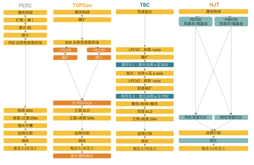 Les cellules solaires sont un élément clé de la filière photovoltaïque et leur rendement de conversion a un impact direct sur la performance de production d'électricité des systèmes photovoltaïques. Actuellement, les principales technologies de cellules solaires disponibles sur le marché sont les technologies PERC, TOPCon, HJT et xBC. Les limites supérieures théoriques du rendement de conversion varient selon les filières technologiques : PERC est de 24,5 %, TOPCon de 28,7 %, HJT de 28,5 % et xBC de 29,1 %. En termes de rendement de conversion en production de masse, PERC est d'environ 24 %, TOPCon d'environ 26 %, HJT d'environ 26 % et xBC d'environ 27 %.